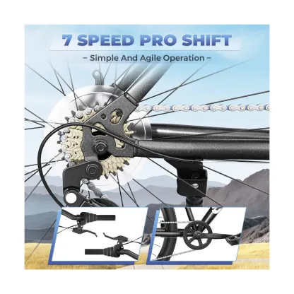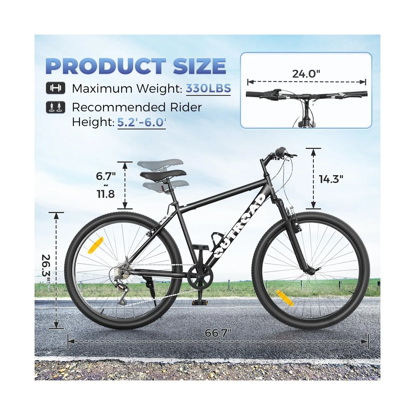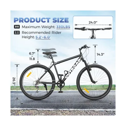[Diseño único] Combinación única de colores con acabado en pintura en aerosol. Ancho de las ruedas: 2 pulgadas; las elegantes llantas de 26 pulgadas ofrecen seguridad y robustez. Incluye un sistema de cambio de 7 velocidades y una excelente suspensión delantera capaz de afrontar terrenos montañosos. Recomendada para ciclistas con una estatura de entre 5'2" y 6'0" (aprox. 1,57 m a 1,83 m). Soporta un peso máximo de hasta 330 libras (aprox. 150 kg).
